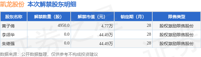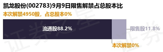 证券之星消息,根据市场公开信息整理,凯龙股份(002783)于9月9日将有4950.0股限售股份解禁,为公司股权激励限售股份,占公司总股本0.0%。(本次数据根据历史公告整理得出,实际情况以上市公司最新公告为准)最近一年内,该股累计解禁9560.42万股,占总股本的19.15%。本次解禁后,公司还有5893.03万股限售股份,占总股本11.8%。具体如下图所示: