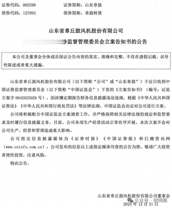12月31日电,山东章鼓(002598.SZ)公告称,公司于近日收到中国证监会下发的《立案告知书》,因涉嫌定期报告财务信息披露违法违规,中国证监会决定对公司进行立案。公司将积极配合证监会立案调查工作,目前各项生产经营活动正常有序开展,本次立案不会对公司生产、经营和管理造成重大影响。